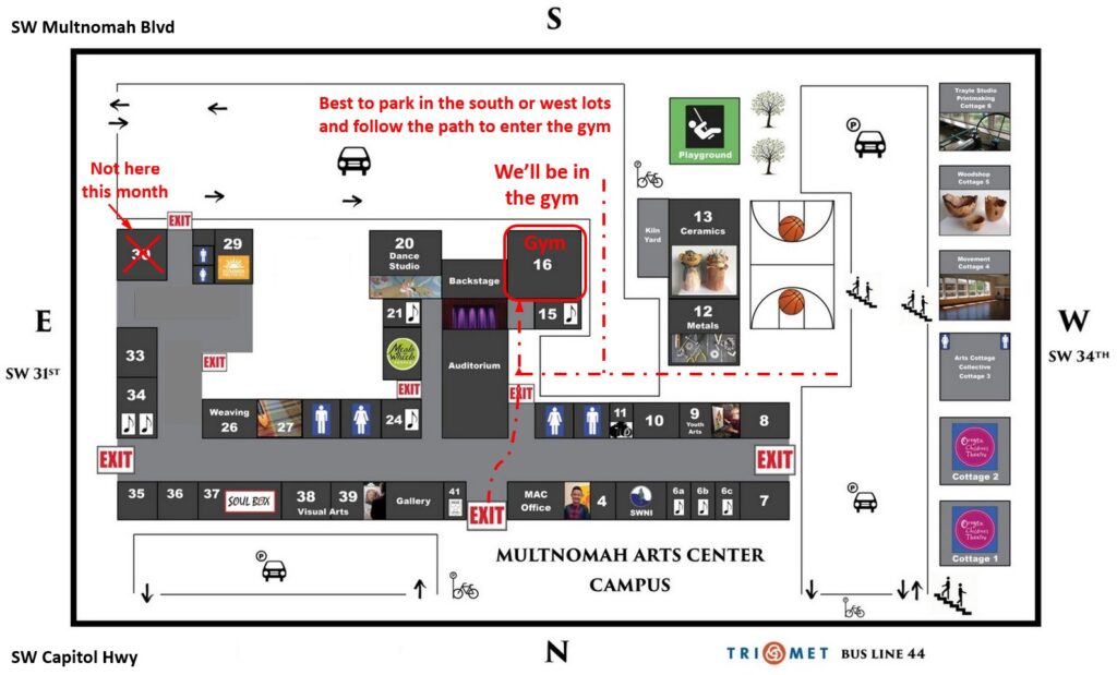Room change: This month we are in the Gymnasium (Rm. 16) – see map below